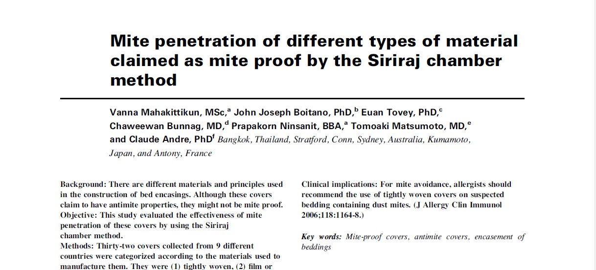 Mite penetration of different types of material claimed as mite proof by the Siriraj chamber method, 2006
